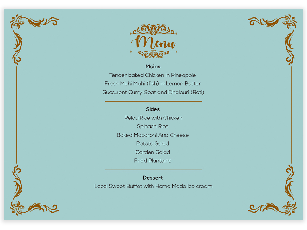- A wedding reception stationery: table-number and menu card.