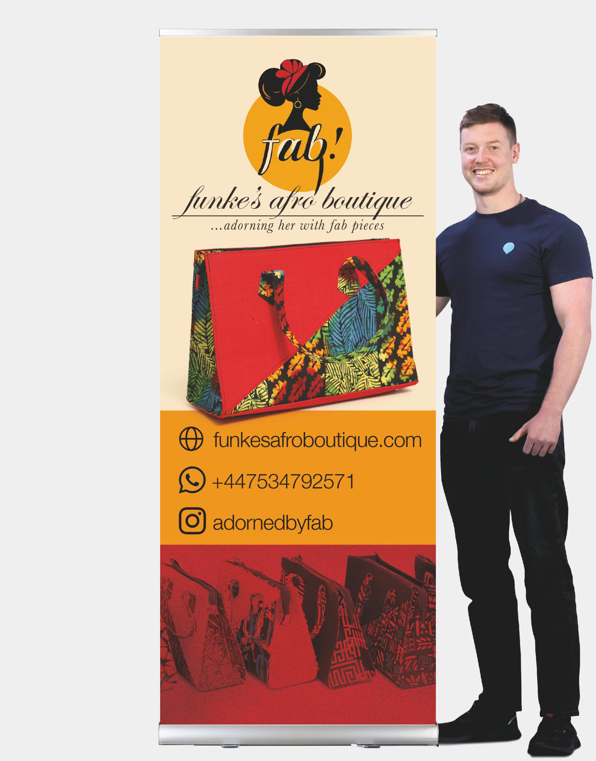 - An African fashion accessories boutique print stationery design: business card, flyer, pull-up roller banner.