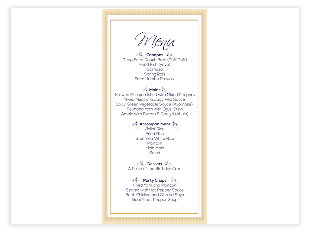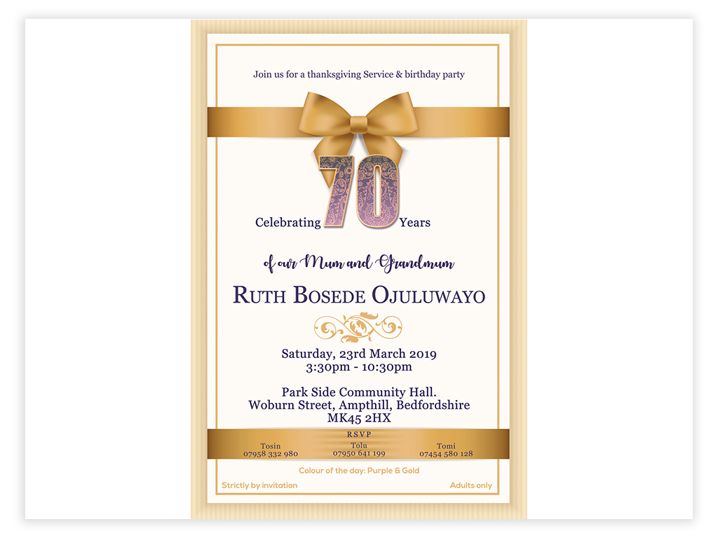 - A 70th birthday invitation, dinner menu card and thanksgiving order of service print.